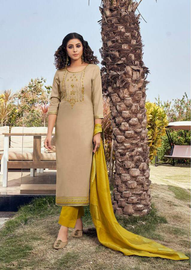 Readymade Straight Suit Set in Jam Silk with Khatli Work- Beige & Yellow