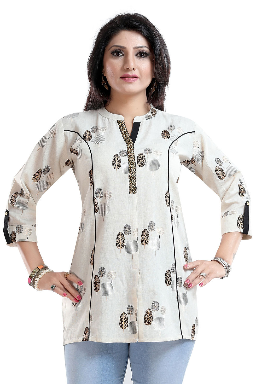 Printed Cotton Roll Up Sleeves Tunic Top in Ivory